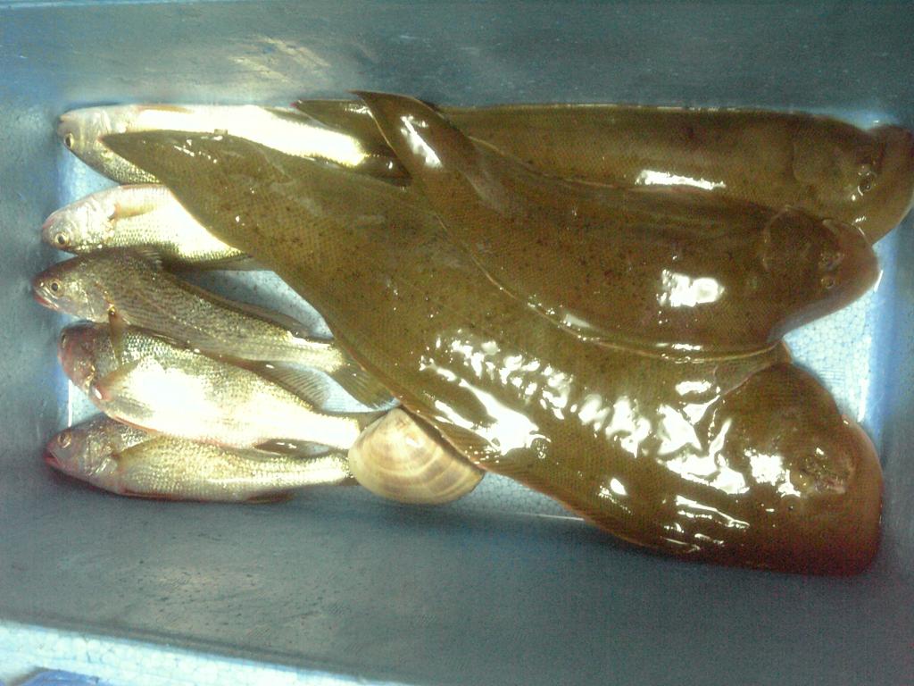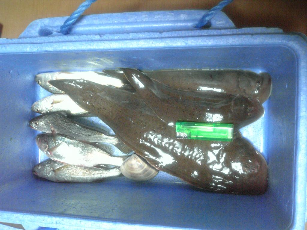 舌平目3匹 イシモチ5匹 偶然取れたハマグリ1個